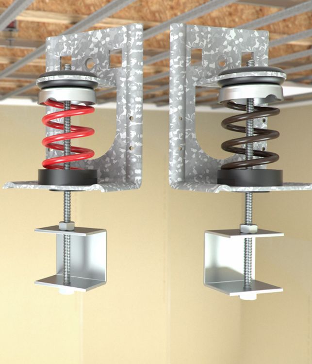 Ceiling hangers isolate gypsum board from structure. Using a resilient element to separate mass inside an airspace is the most effective way to raise STC and IIC ratings. Select from full performance one-inch deflection spring hangers or an install friendly low-profile pad hanger.